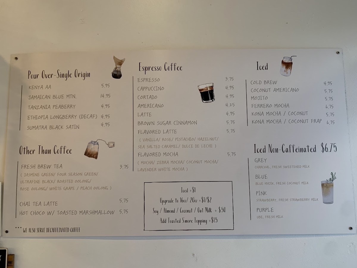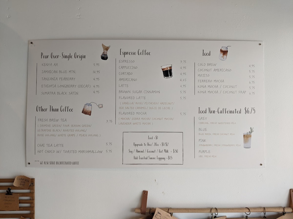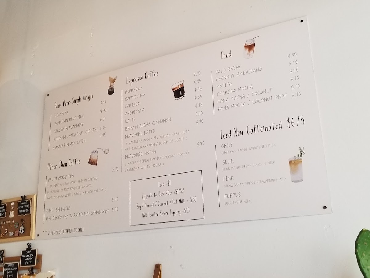- Non-Caffeinated Beverages: Guava Nectar Juice, Pink Strawberry milk, Unfiltered Apple Juice, Purple Ube milk, Blue Blue Majik with coconut milk, Steamed Milk, Grey Charcoal milk, Strawberry Pink Lemonade, and Cinnamon Horchata Latte.