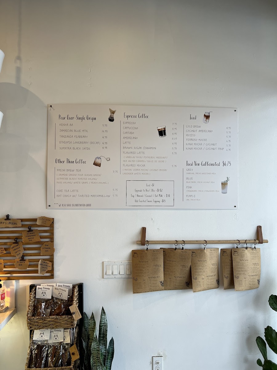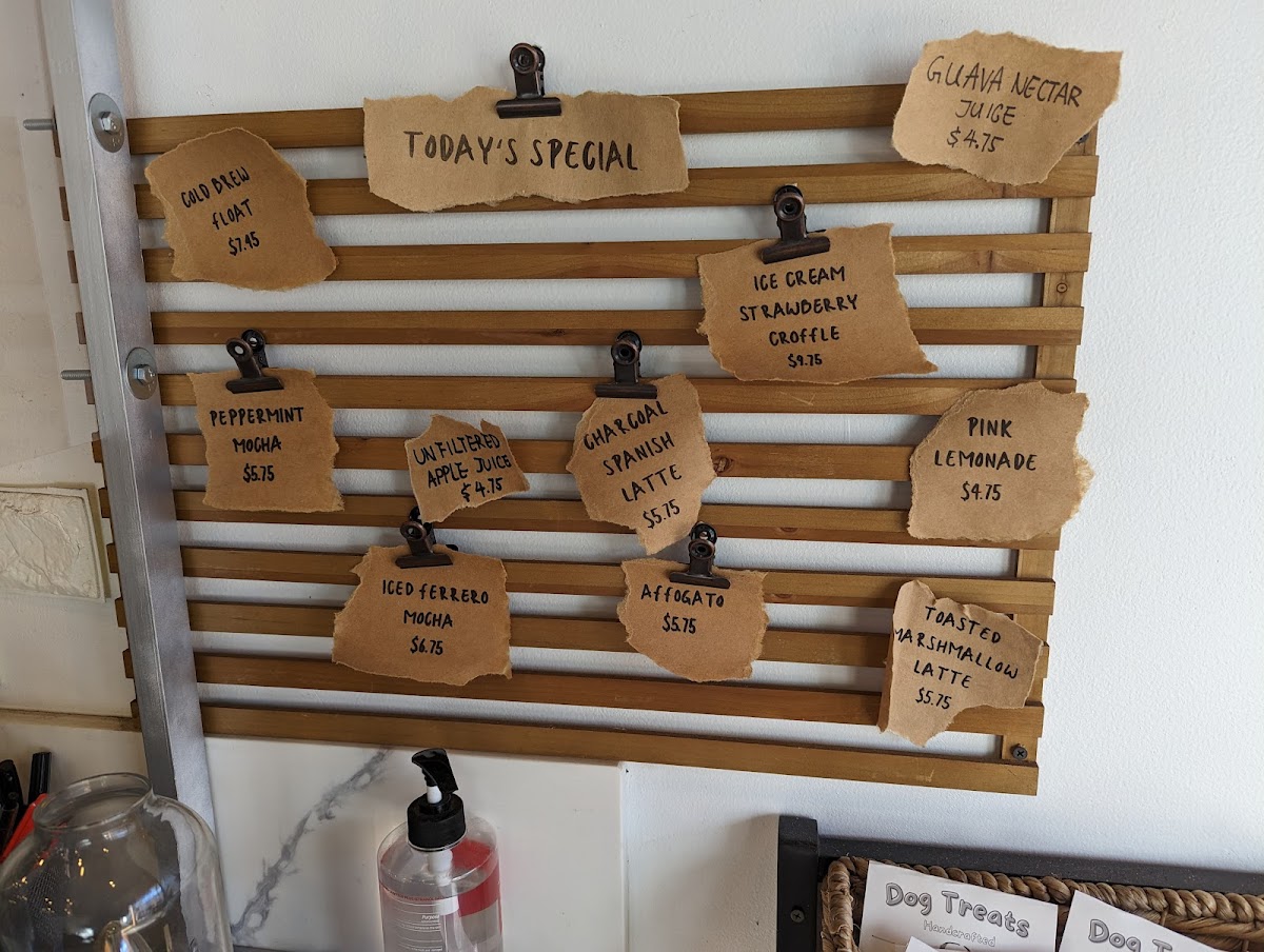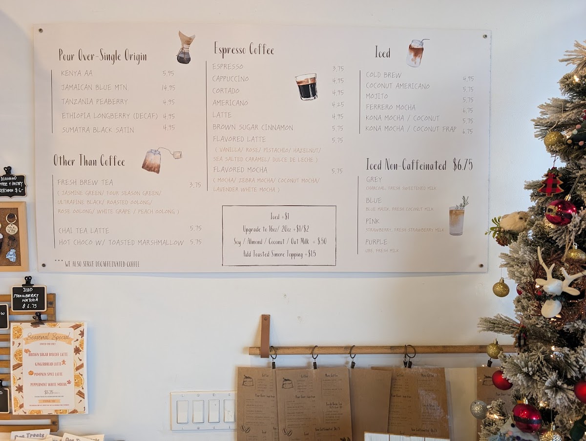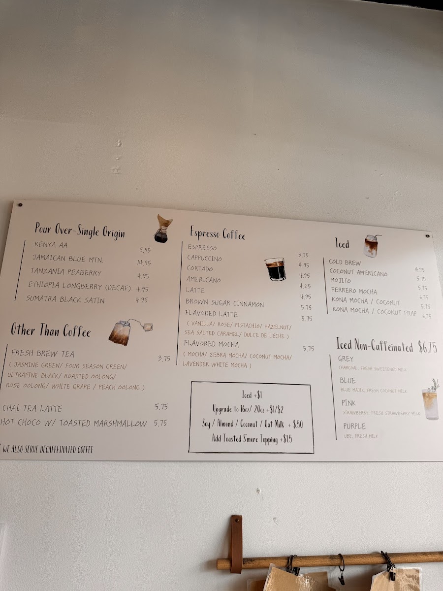 - Non-Caffeinated Beverages: Guava Nectar Juice, Pink Strawberry milk, Unfiltered Apple Juice, Purple Ube milk, Blue Blue Majik with coconut milk, Steamed Milk, Grey Charcoal milk, Strawberry Pink Lemonade, and Cinnamon Horchata Latte.